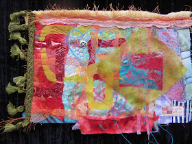 The shiny green fabric was stamped with my hand made alligator stamp. Need to work on that one. |