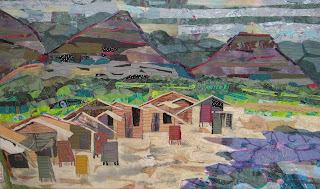 | gelatin mono print, deconstructed screen printed, thread, paint, stamps, stencils & oil pastels |